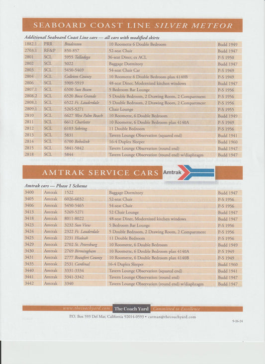 CY-2800/2800.1 Coach Yard 1969-1971 Seaboard Coast Line (SCL) Silver Meteor & Additional Cars + Amtrak