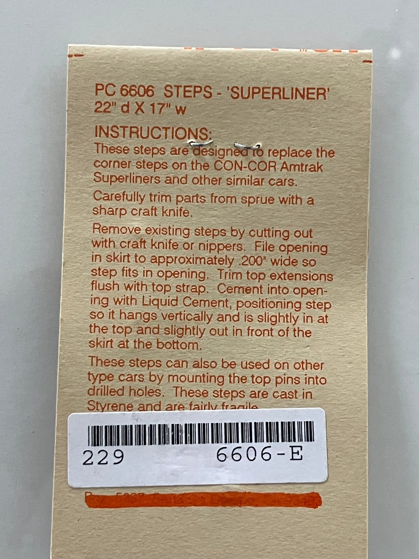 HO scale Superliner steps detail part. 22" deep x 17" wide. Package of 8. Plastic.
