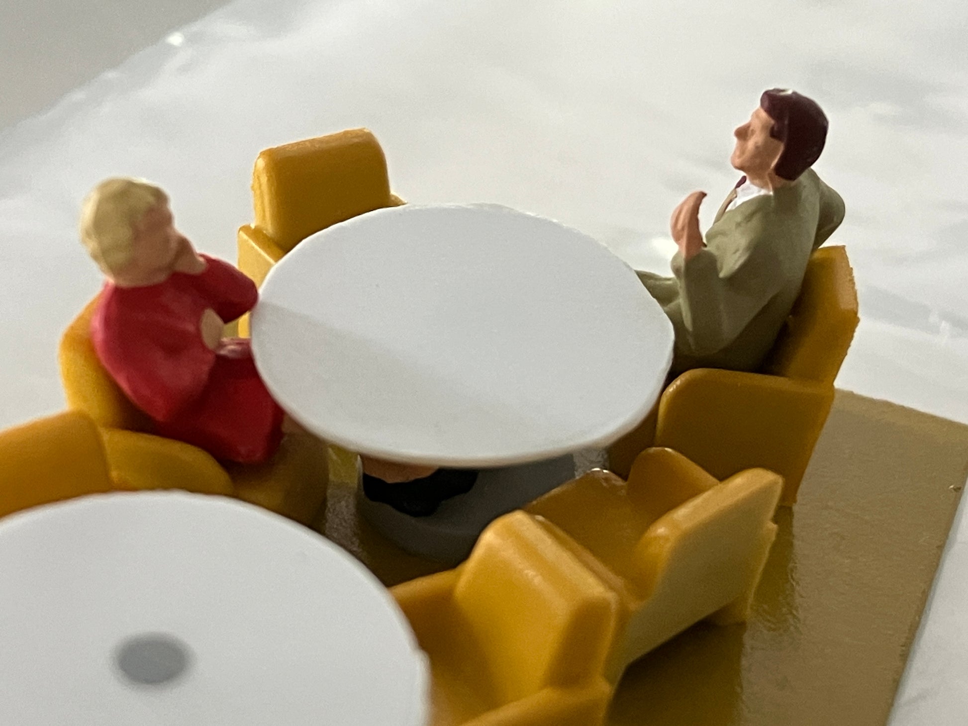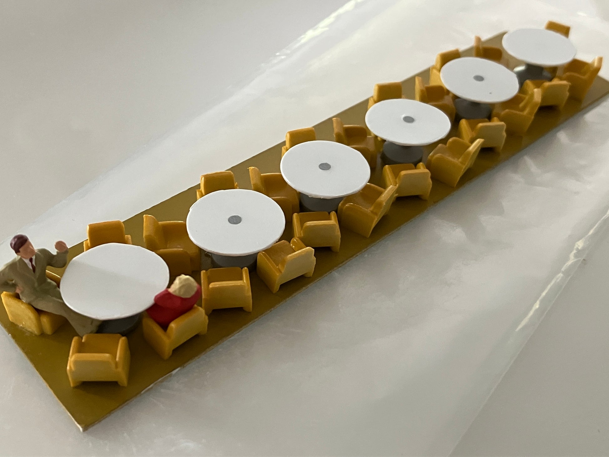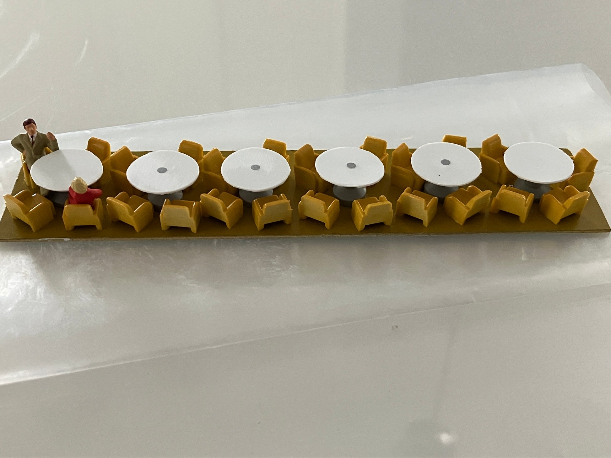 Scratchbuilt section for Union Pacific "City of Denver" and "Overland" heritage dining cars. Made to be put in place of existing dining area of Walther's Proto Union Pacific dining cars. Section includes six round tables and 36 chairs painted in UP Armour Yellow. Includes two Preiser passengers as a bonus.