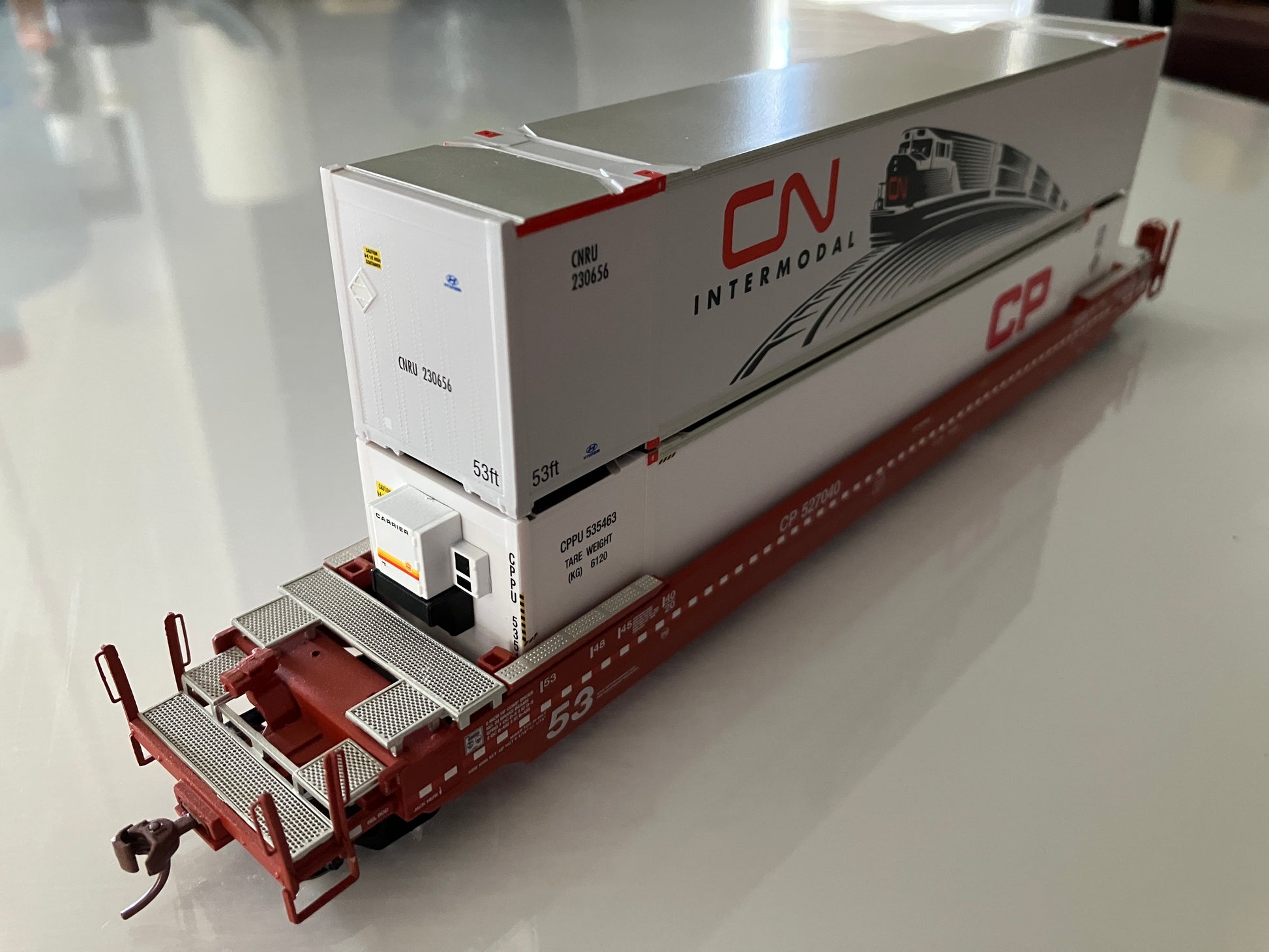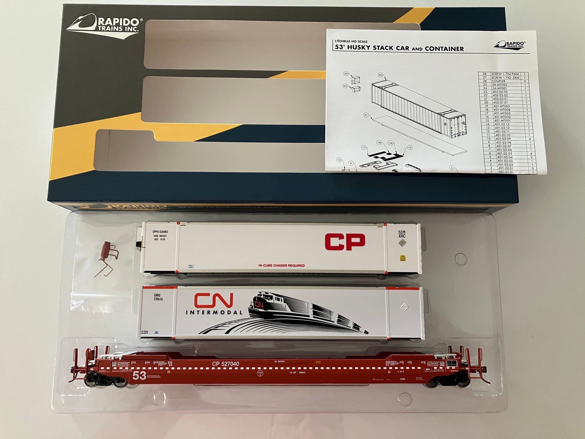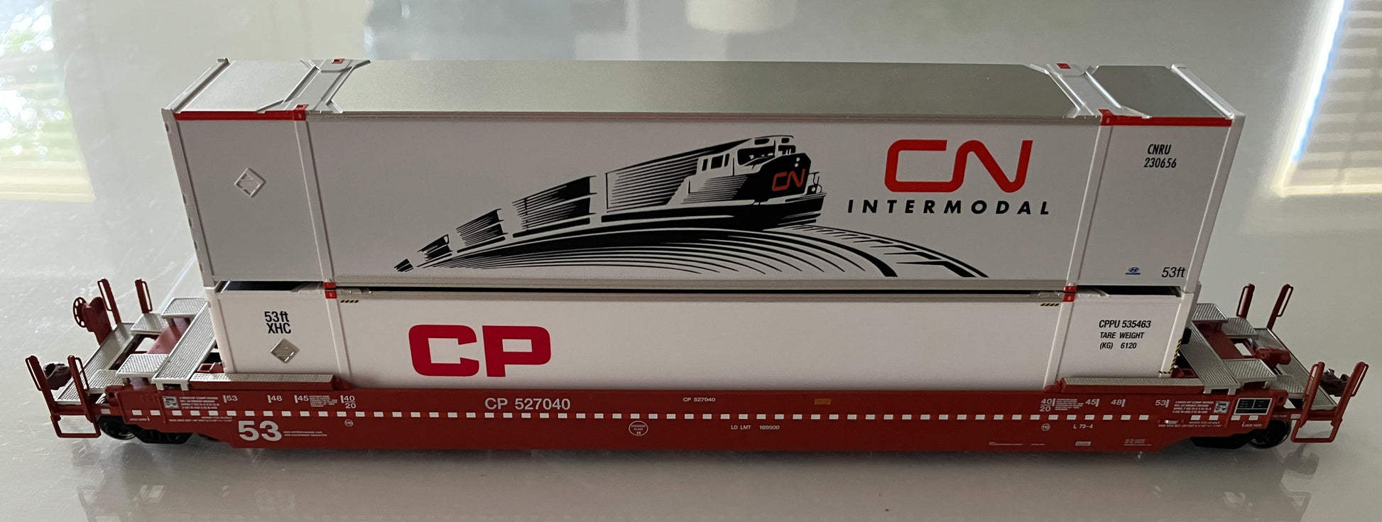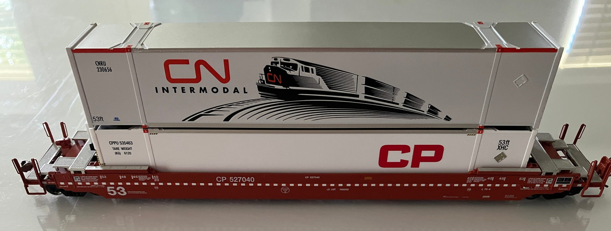 Rapido Husky-Stack container car, CP #527040 w/53' CP and CN InterModal containers.