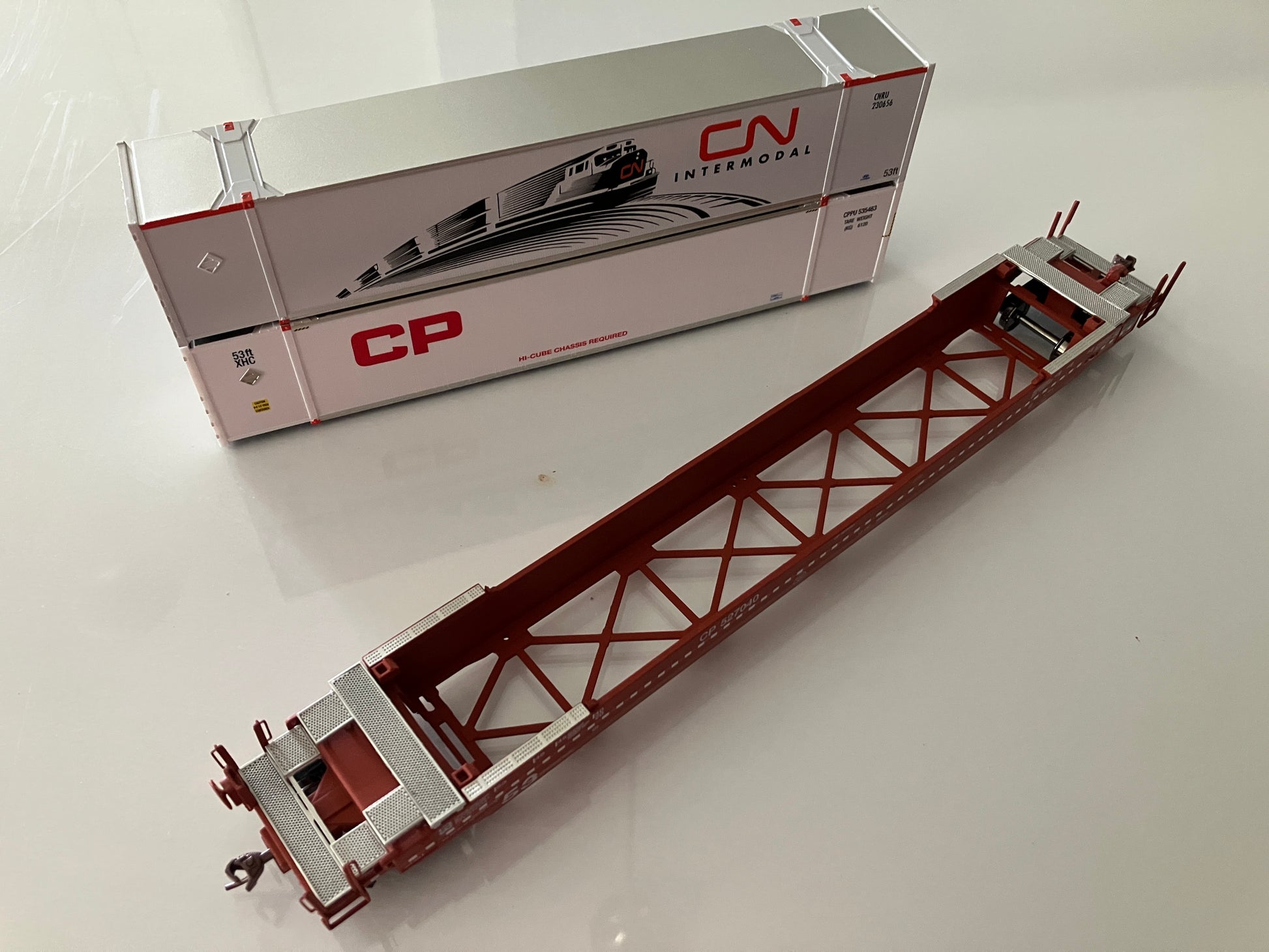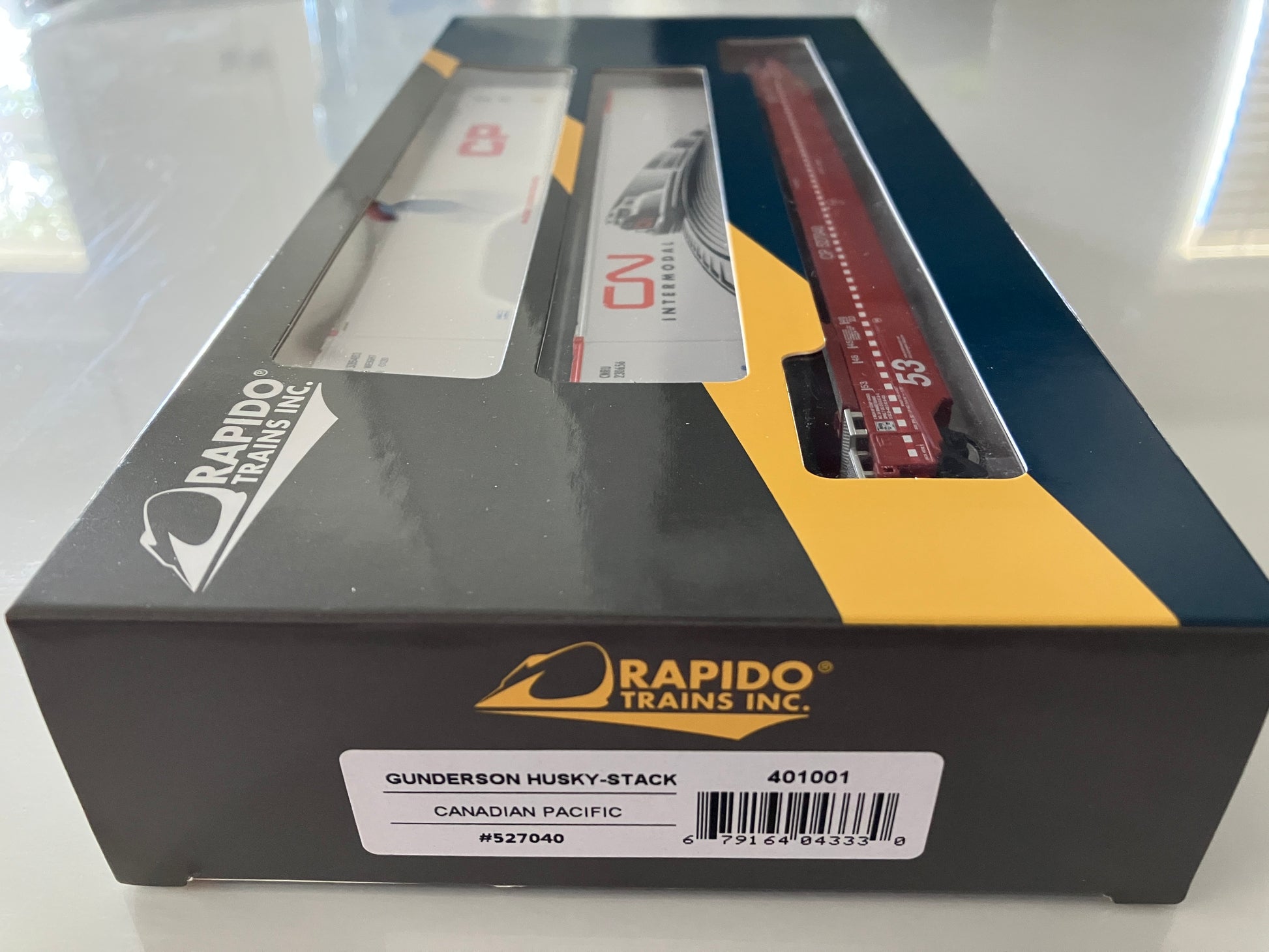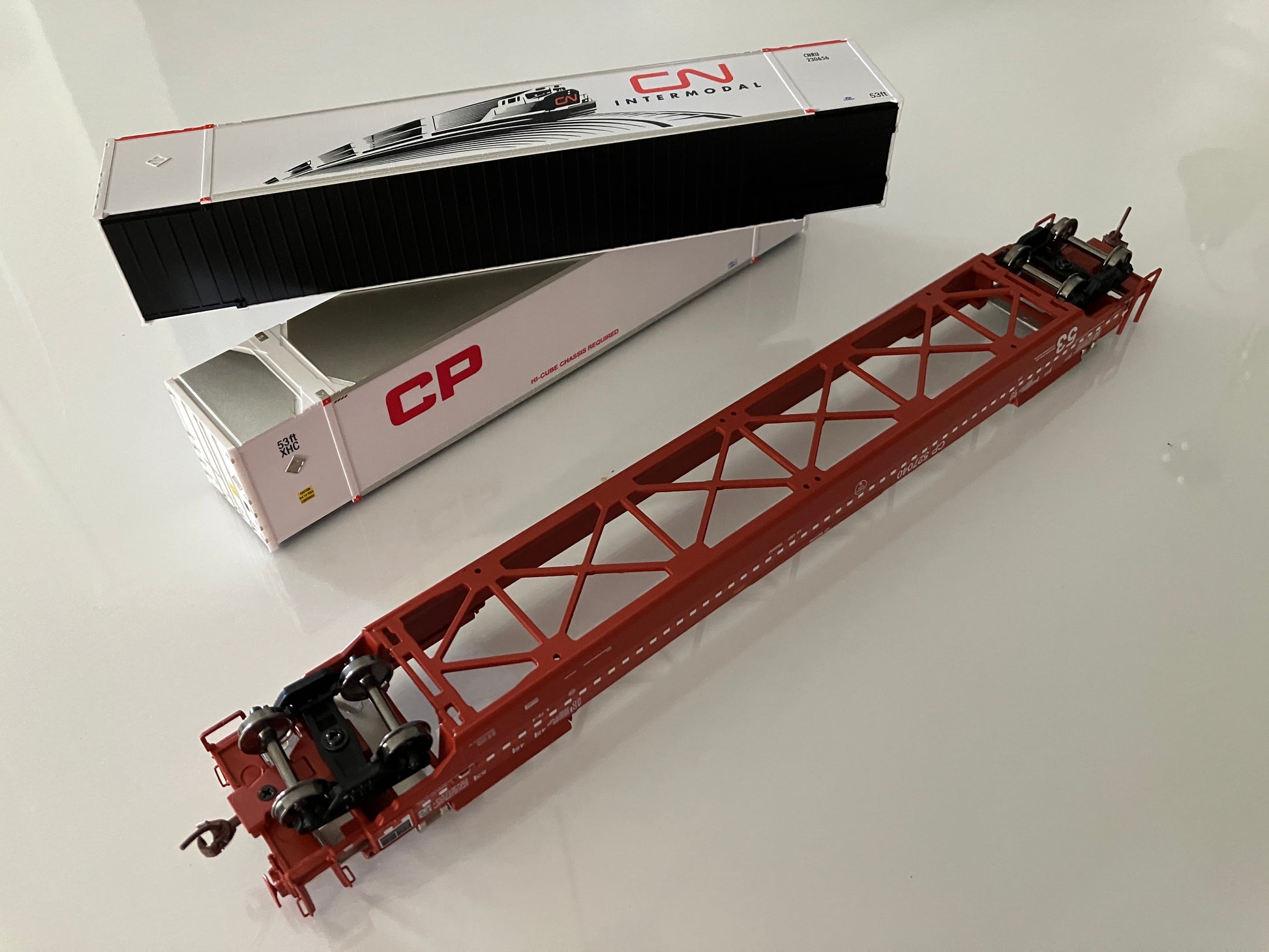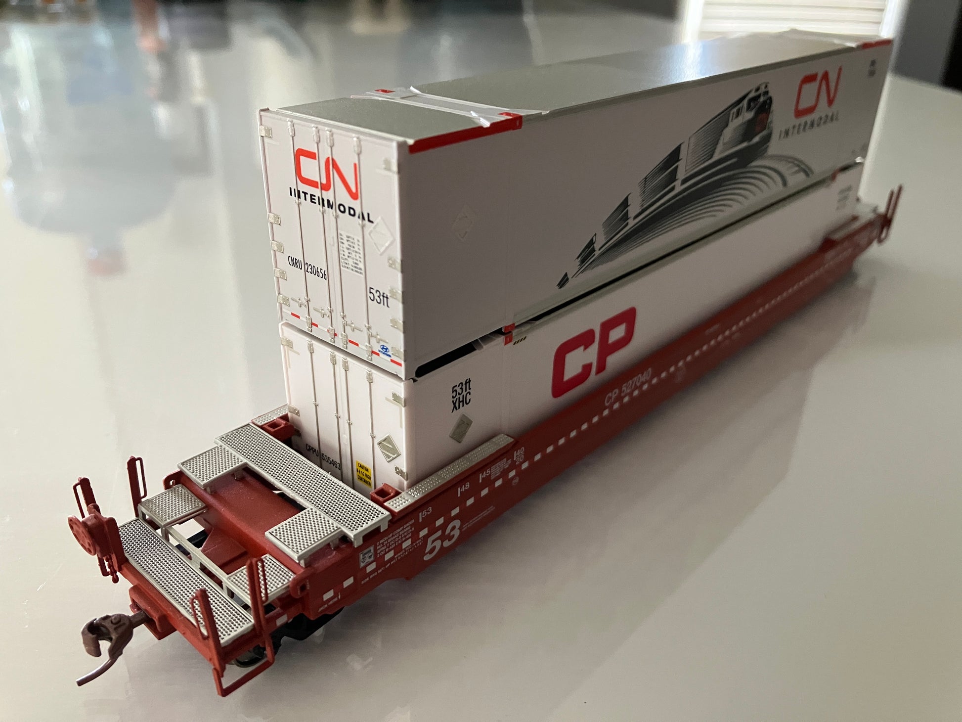 Rapido Husky-Stack container car, CP #527040 w/53' CP and CN InterModal containers.